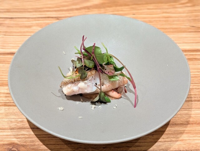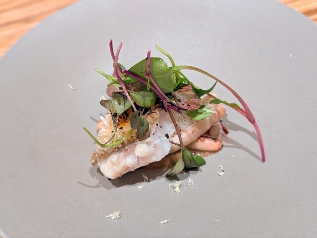 パリパリの皮目にしっとりとした身を主役に、玉葱の麹ソース、鰹の酒盗、クリームのカプチーノソース、京都大徳寺のあめ味噌?をアクセントにした発酵料理。