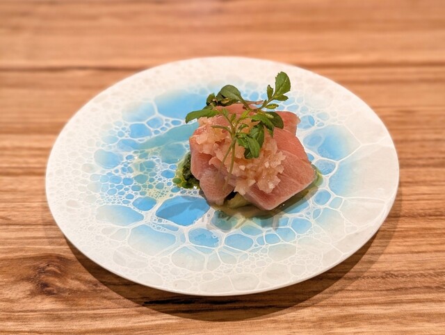 鮪の旨みと甘み、マリネされた茄子、ガルム(スペインの魚醤)で味付けされたエシャロットのバランスが良い。