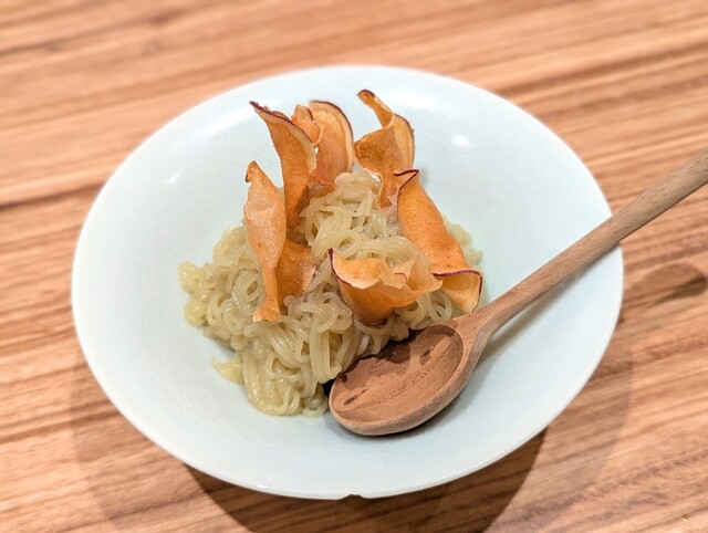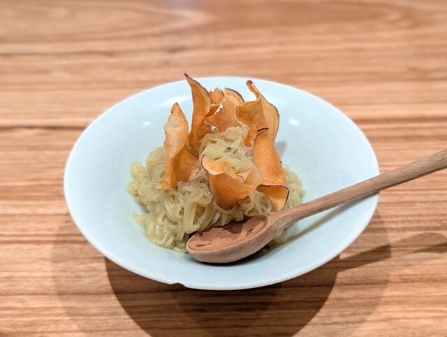 ドウマンガニのビスクと一緒に掬っていただけば、蟹の豊かな風味とお出汁の心緩む味わいが口いっぱいに広がる。