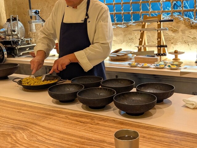 金目鯛を使ったパエリア。味が入り程よく食感を残したお米は、おこげ部分の香ばしさも感じられる。ふっくらとした金目鯛の身に唐墨の風味が心地良い。レモンを絞って爽やかな変化も楽しめる。