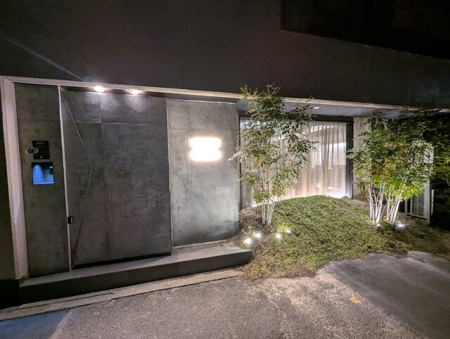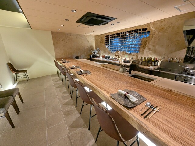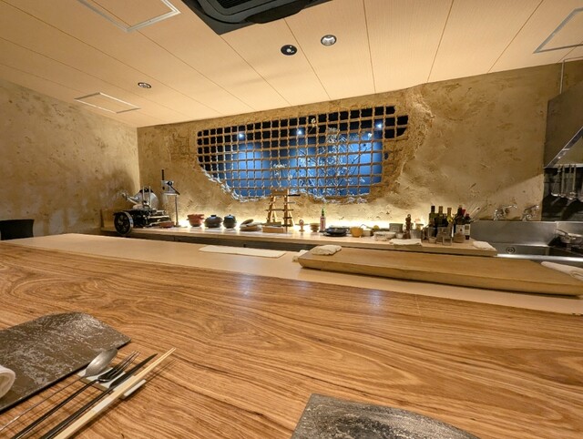 手をかざすと開く重厚なコンクリートの扉。奥にあるお店に入ると、カウンター9席のモダンな店内。奥に見える土塀が、さり気なく和の雰囲気も醸し出している。