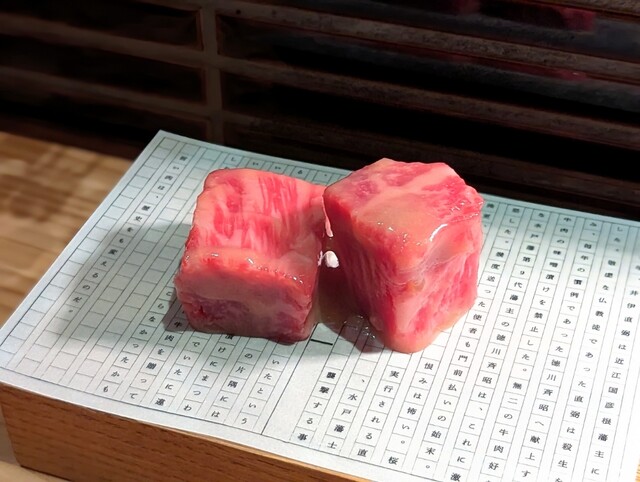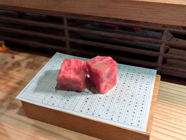 階段を登った先には、格子扉と店名の書かれた木の札が掛かるシンプルな入口。中に入ると、掘り炬燵のカウンターが奥へと続く、落ち着いた和空間。大将さんの手元にある間接照明が、お肉の姿を一層引き立てているように見える。