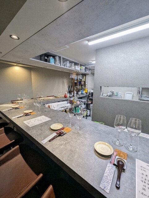 Googleマップを頼りに向かうと目印となる看板はなく、ここがお店だと知らなければ辿り着けなさそうな建物。奥へと長い店内には、L字のカウンターとテーブル席。グレーを基調としたカウンターはお料理がよく映える。