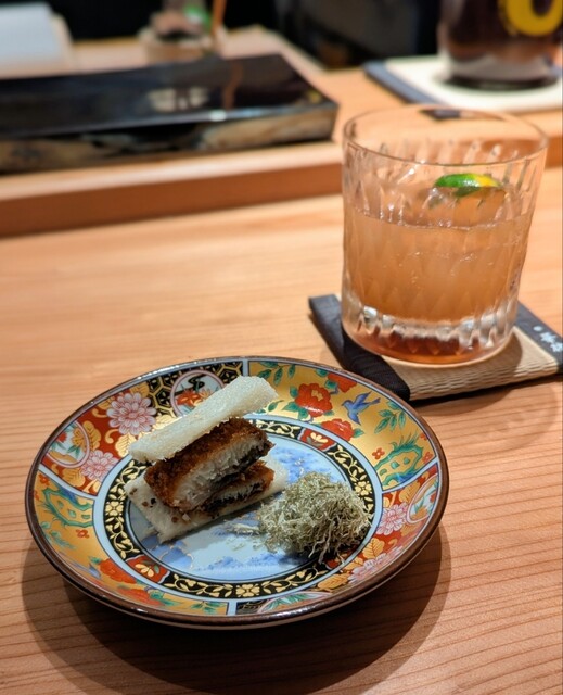中華スパイスを使ったタレ、生胡椒の塩漬け、サワークリームを練り込んだパンを使ったカツサンドから始まったコース。