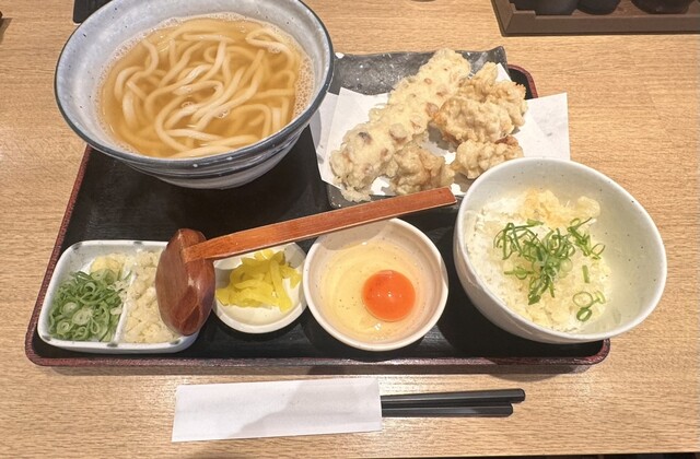 鶏天・ちく天 かけうどん 卵かけご飯orシャケご飯 950円(プラス50円で鯛めしに変更可)
