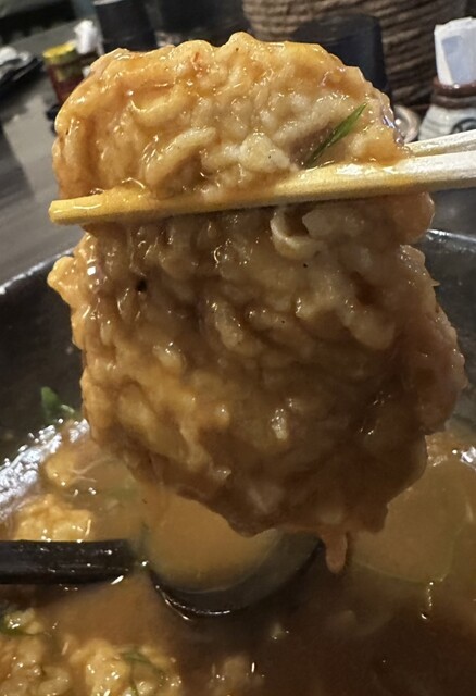 まず目についたのがてんこ盛りされた青ネギ、そして丼の半分近くを覆うデッカいとり天、右端には太くカットされた薄揚げ達