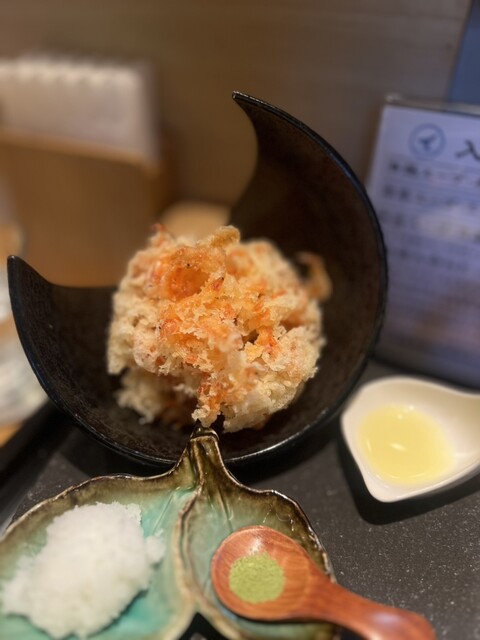 かき揚げもすぐに提供され、器の上には抹茶塩、大根おろし、味変用オイルなど。