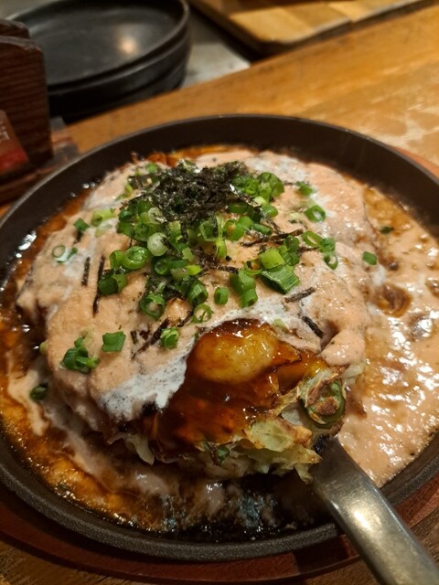 もちと明太子のお好み焼きは、ふっくらしていて明太子の味もしっかりしていて