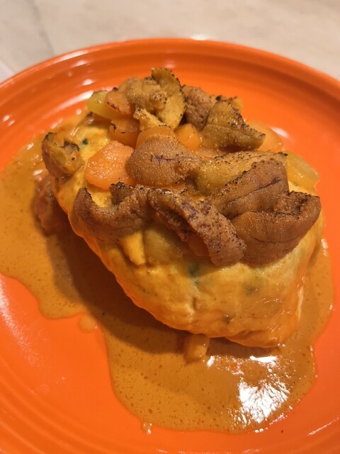 炙り金目鯛のカルパッチョは柑橘や野菜のソースがたっぷりで酸味と甘味とほろ苦みが絶妙です。金目鯛も炙りで香ばしくなっていてソースに負けないうまみです。パンに乗せて食べたらgoodです。