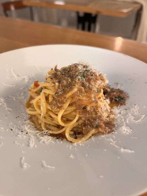最後にイノシシとごぼう、蕗の薹のラグーソースパスタ。すごい組み合わせですがそれぞれの味をしっかり感じます。それぞれが強い味わいを持っていますがかき消すことなく相乗効果で味が重なって押し寄せてきます。季節ものですが一年中置いてほしいと思う美味しさ。