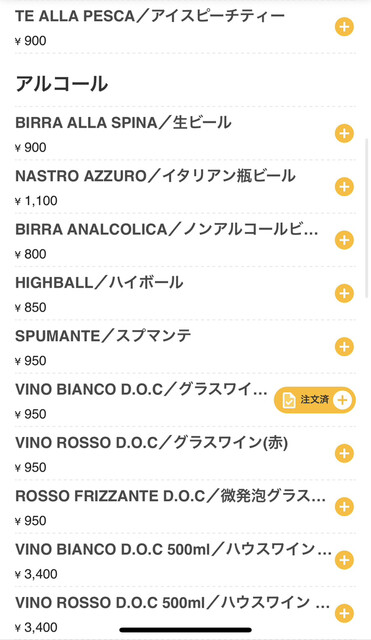 店内は気取らないトラットリアといった趣で、活気にあふれた空間。まずは「グラスワインの白」を2つ注文して乾杯。昼から美味しいピッツァを待ちながらワインを傾けるのは、まさに至福のひとときです。