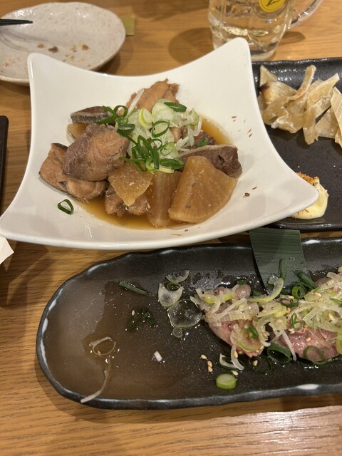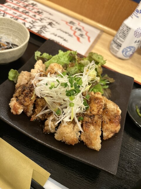 竜田揚げ鶏もも肉に黒胡椒が効いた甘辛いタレとネギが乗せられております。
