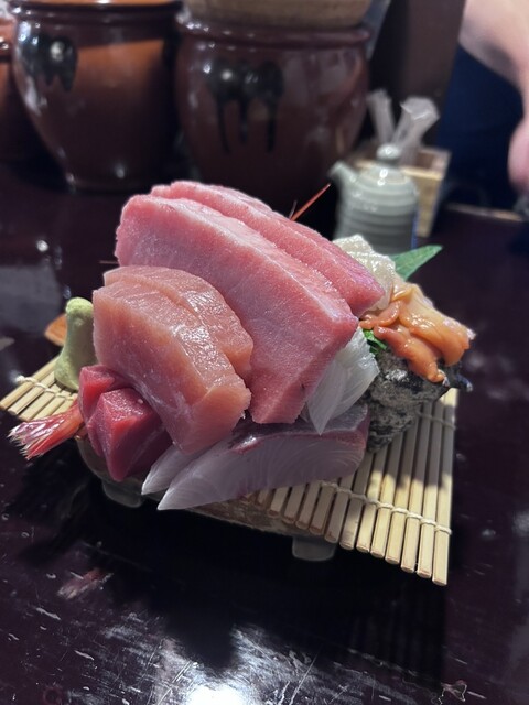 お刺身盛り合わせは迫力ありすぎて思わず声が出てしまうほど…!11種類ものお刺身がジェンガみたいに重なってて、どれを食べても新鮮でおいしい。特に鮪が口の中でとろけて最高でした。
