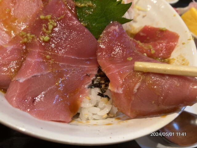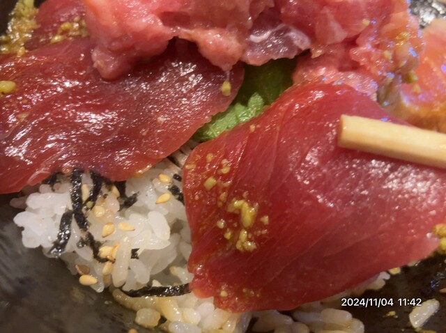 11月1日から4日まで「生本鮪5種丼「が¥1,980のところ ¥1,480になるので、伺いまして表記品を頂きました11:30定刻開店時間の10:40頃着いたら4人待ちに接続 開店前に従業員がオーダー取りに来た その時は15番目に聴かれた なので、入店時はオーダー取り時、割り込んできた7人の前に