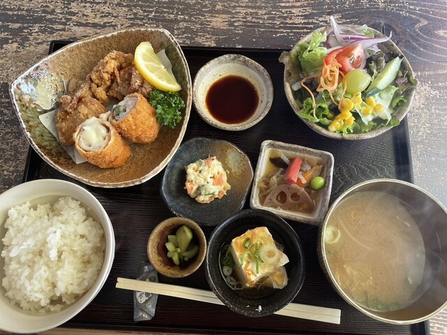 大葉とチーズ旨豚カツと鳥唐揚げセット1050円税込、ご飯お代わり350円税込