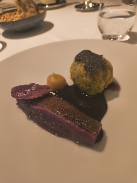 驚くほど柔らかく焼き上げられた鴨に、クラシックで濃厚な赤ワインソースが寄り添います。ジビエの力強さを引き出しつつ、どこまでも上品な仕上がり。