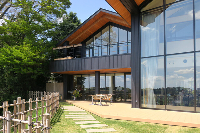 大きなガラス張りの建物は木材も惜しみなく使われて