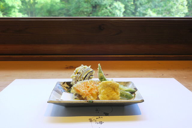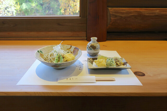 まずは丁寧で美しき盛り付けのゆば蕎麦、