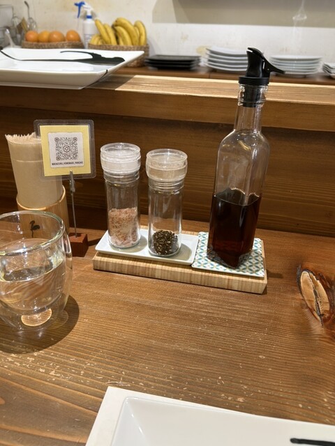 卓上にピンクソルト、胡椒、メープルシロップが置いてあり味変できます。