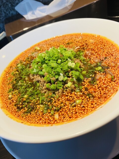 真っ赤な辣油の輝きに湯気上がる温かい麺!トッピングはひき肉に松の実や白葱のみじん、小松菜の緑が鮮やかです!