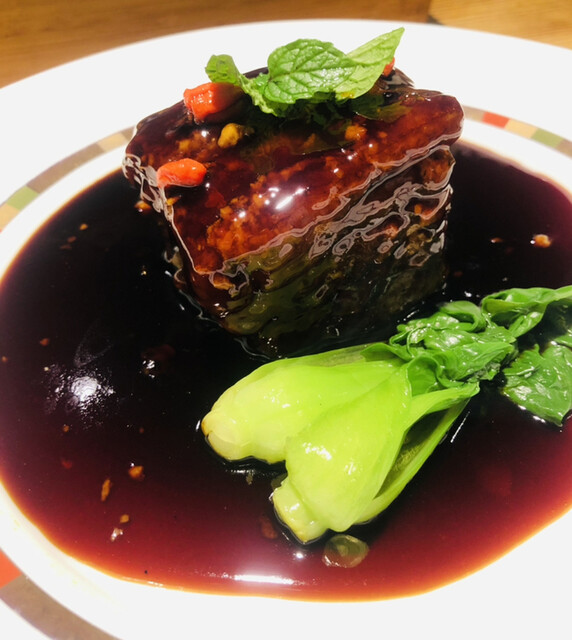 芳しい香りを放ちながら黒光りに輝く一塊の角煮酢豚!表面サクッと中はしっとりトロけるよう♫
