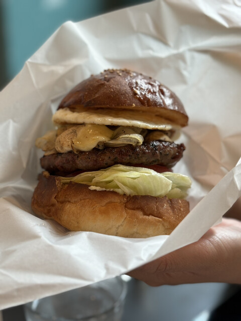 香辛料の効いたほろほろのプルドポークと、ハンドチョップのごろごろパティの食感差、肉感がたまらない。
