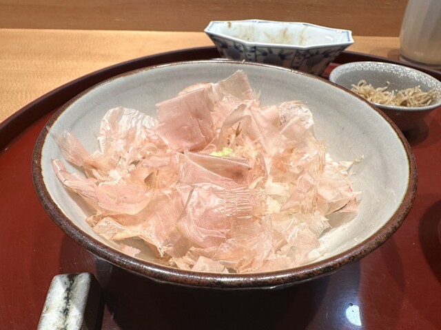 ー鰹節ご飯、鮎の頭と尾で取った出汁でお茶漬け的に