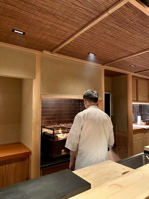 以前はL字型のカウンターで奥行き幅があまりなく、座席もスツールっぽくちょっとだけ高くなっていたような覚えがあり、それに比べると横一線の8人掛けのゆったりとしたカウンターは本当に落ち着けますし、焼き物の炉が目の前にあったり、お料理の動線やスペース的にもはるかにやりやすくなったのではないでしょうか。