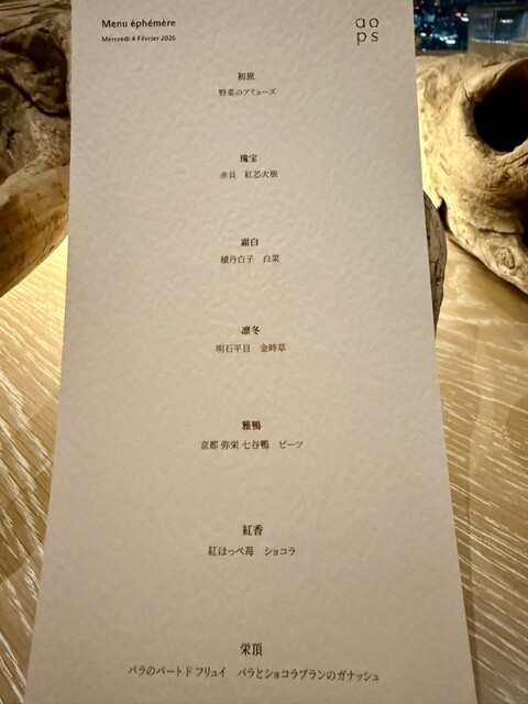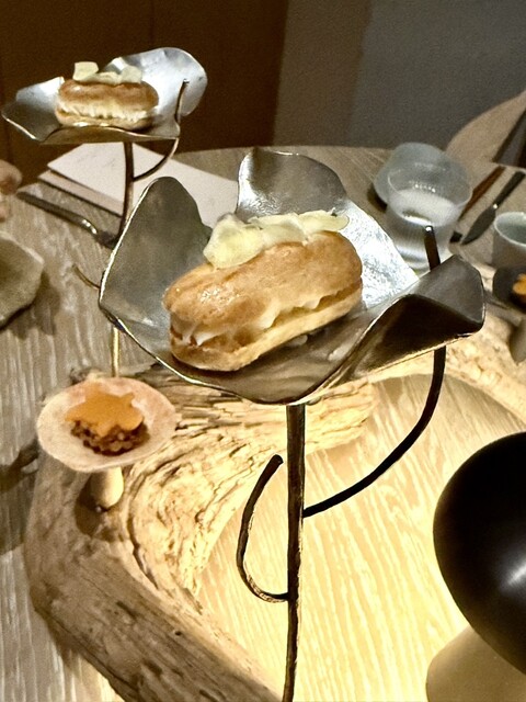 最初のアミューズが飾られた流木のような木木、帰りに見るとこれが壁にかけられたアート作品になっているという、、、心底うっとりさせられます。