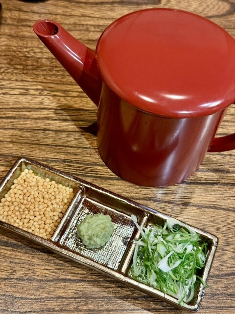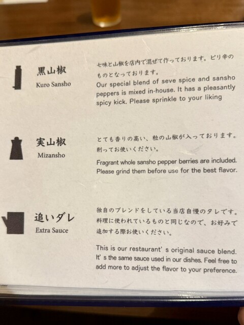 卓上にある、黒山椒、実山椒、追いダレでいろいろな食べ方もできます。