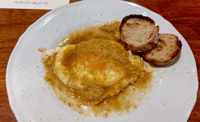 目玉焼きとカラスミは、その名の通りですが、目玉焼きはカルピスバターと一緒に揚げ焼きにしているそうで、優しい乳系の風味とまろやかさを楽しめ、そこにカラスミの塩味と濃厚な魚介の風味を感じてとても美味しく、付け合わせのバケットともよく合い美味しく、白ワインが進みました。