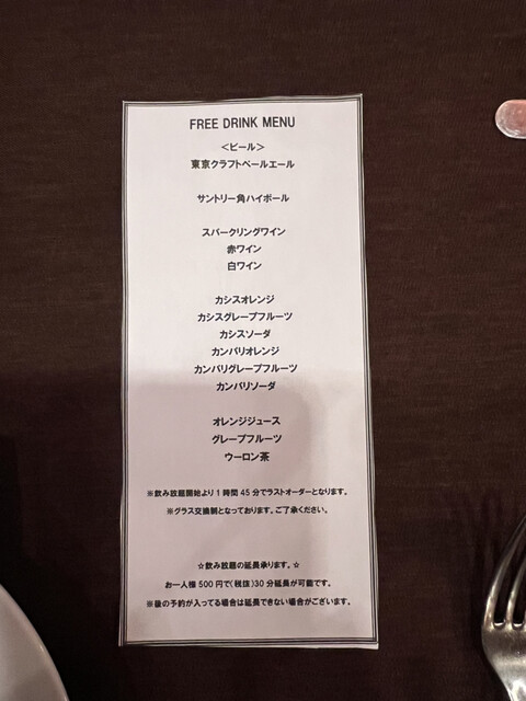飲み放題はクラフトビール、角ハイボール、ワイン(赤・白・スパークリング)、カクテル、ジュースと内容も良く、また伺いたいお店です。