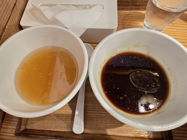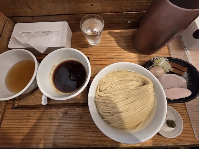 東京No1のつけ麺があると知ってやってきました。平日の9時40分くらいに到着。1番乗りでした。お店の前に椅子が何個かあるので大分楽に待つ事が出来ました。オープンの時には平日なのに40人くらい並んでいました。恐るべしです。お店に入って食券機でつけ麺300グラムにプラス200グラム。味玉と塩、わさびを買い店員さんに渡し漬け汁はあさり油とコーチン油で注文。しばらくしてやって来ました。まず麺をひと口美味しいです。少しかための中太麺が抜群に美味しいです。そのままで食べて塩をつけて食べて、わさびをつけて食べました。漬け汁は2つとも普通に美味しいです。チャーシュー2種類とメンマ、ネギ、煮玉子も普通に美味しいです。ただ麺の美味しさが際立っていてあまり目立たなくなっていました。途中からは漬け汁につけずにそのまま食べていました。500グラムあったので充分堪能する事が出来ました。〆は煮玉子を美味しくいただき楽しいひとときをありがとうございました。ごちそうさまでした。