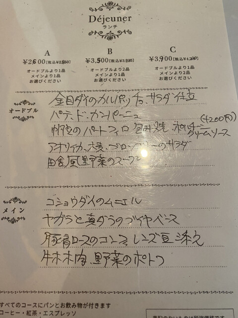 コースは3種、前菜とメインの数が異なります。我々は前菜2種、メイン1種のBコース3500円を。