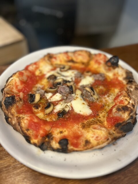今回はボードに書いてあるものからピザを2枚頼みました。フンギは旬のキノコのぷりぷり感と自家製ソーセージの旨み、モッツァレラの塩味がいいバランスで今日頼んだ中で1番好きだったかも♪