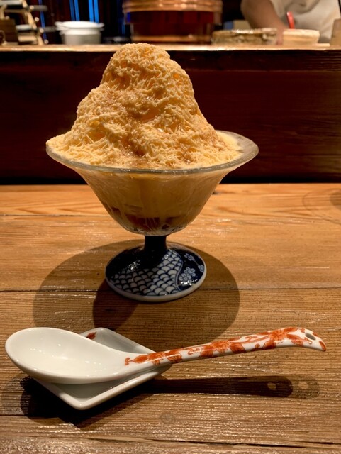 合間に、いくらがたっぷり乗った冷製茶碗蒸し、アルコール40度の緑茶マティーニ(これがウェルカムドリンク)に焼物と、テンポ良く提供。伊勢海老ビスク(麺入り)〆にミルクセーキのかき氷でスッキリ覚醒。