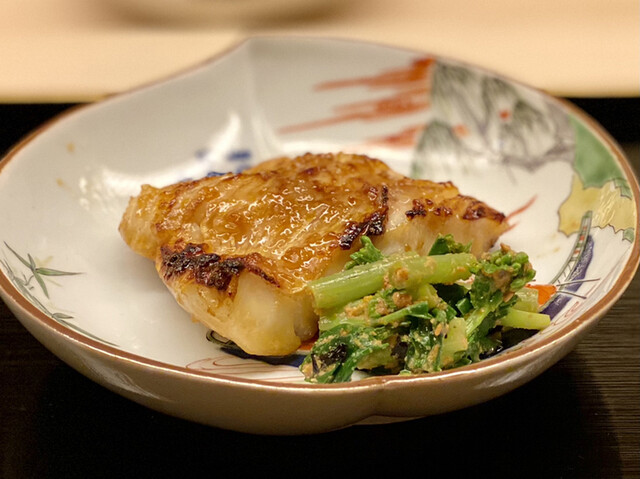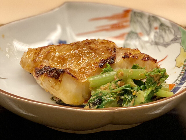 ・白甘鯛の幽庵焼き、花山葵の胡麻酢和え