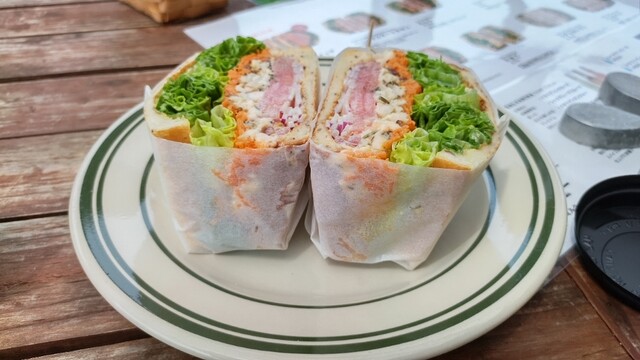 一口食べて今までのサンドイッチとちょっと違う味わいを感じましたトマトソースがメインで野菜に岩塩が効かせてあってほのかにマスタードの味がします!