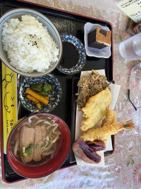 まる天のお得セット2,000円定食をいただきました。海老天、鶏胸肉天、お好み天、紫芋フライとモズク天に沖縄そば、ご飯、漬物、デザートでした。