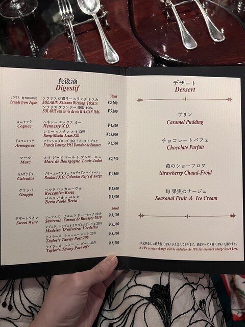 デザートを4種類から選ぶことができ、食後の焼き菓子と紅茶orコーヒーもサーブされてきました。席の目の前でフランベしてくれるデザートもあり、最後まで楽しませていただきました。