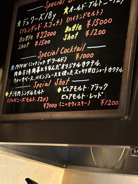 彼女と食後にゆっくりお酒を飲みたくて見つけたこのお店。お店を選んだ理由はウィスキーの種類の多さ。最近barではあまり見かけなくなった銘柄のウィスキーがリストに載っていたので、迷わず選びました。