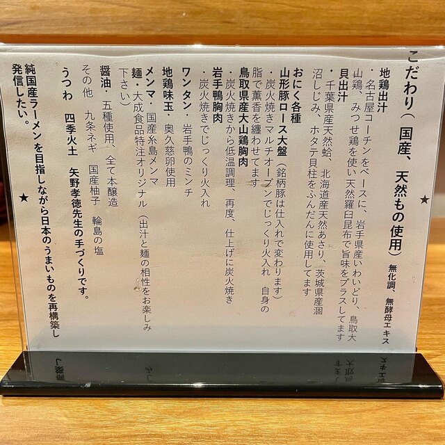 出汁は4種の地鶏・羅臼昆布から取った鶏出汁と、天然蛤・天然あさり・涸沼(ひぬま)しじみ・ホタテの貝柱から取った貝出汁を合わせたWスープ。