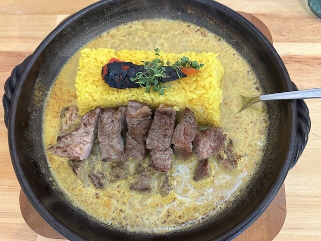カレーのスープが文字通り沸騰しています。ココナッツとスパイスの香りが広がります。真ん中に煉瓦みたいなブロック状のターメリックライス。黒コゲのパプリカと何かのスプラウトが鮮やか。そしてライスの手前にこんがり焼けた小振りの豚肩ロースが2枚。