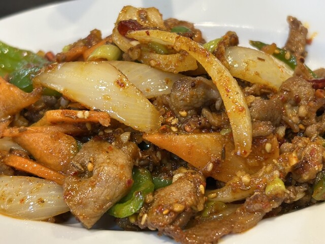 そして薄切りのラム肉と香味野菜がたっぷりの炒め物。ラム肉は柔らかくジューシーで独特の風味がクミンに合うなー。香味野菜もベストマッチ。クミンと唐辛子の他にも何かのスパイスが効いているがよくわからない。プチプチとしたゴマの食感も楽しく、濃いめの味付けで白飯が進みます。こりゃあ美味い!