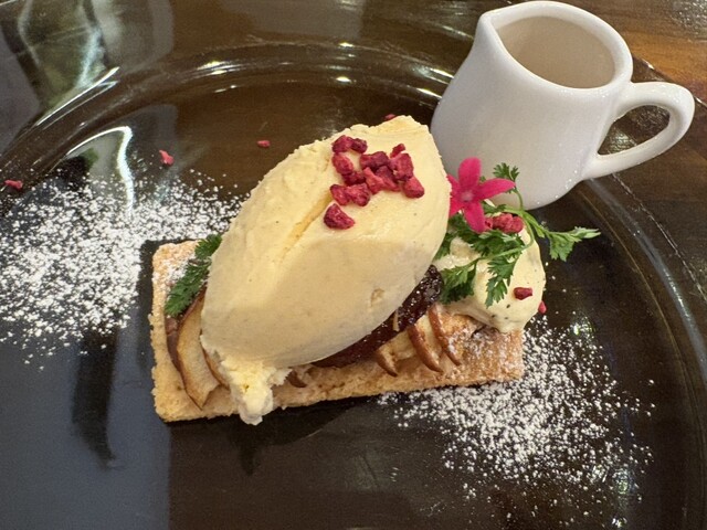 下にはアップルローストやチーズのフロマージュが…オレンジのホットなソースをかけて味変します