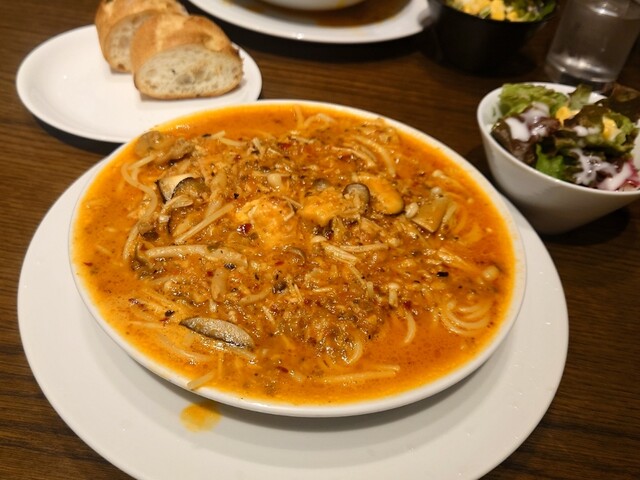 たっぷりのきのこ、ガーリック、オリーブ、トマトクリームにとろけるチーズが絡まり、あと引く美味しさ♪