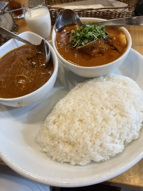 カレーを求めて小川町界隈を徘徊しこちらを見つけ入店。ランチの2種カレーセットで、夏のスパイシーブイヤベースと辛口チキンカレーを注文。なかなかのボリューム。チキンカレーもとても美味しかったが、ブイヤベースが驚くほど美味い!アサリ、ムール貝、牡蠣、イワシ?などふんだんに入った魚介からの旨みが鮮烈なスパイスと並び立つ。追加料金かかるが納得、大変満足度高い。