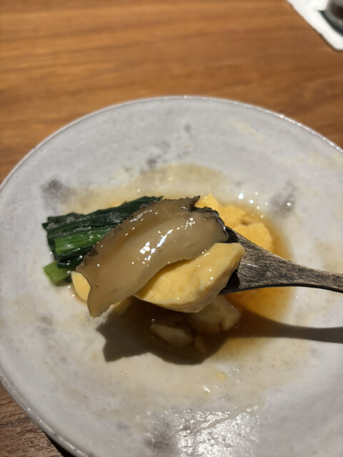 スタートの甘エビの茶碗蒸しは、生と湯引きの食感の違いやプチプチの卵、香ばしい頭のフライまで楽しめ、ひと皿で味わいの幅を感じられます。鳥取県琴浦産サーモンのフィッシュバーガーは自家製バンズにアスパラやじゃがいもを重ね、野菜と魚の旨みが見事に調和。伝助アナゴのフリットは甘みのあるさつまいもと合わせ、香ばしさが引き立ちます。