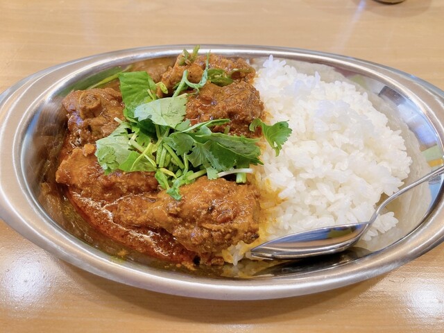スパイシーなカリーに青唐辛子とパクチーが合わさって、口の中が幸せで溢れていきます。チキンもゴロゴロ入っていて、ホロホロうんめ〜です。300gまでなら大盛無料なのも嬉しい。ごはんだけでなく、カリーもやや増ししてくれます!
