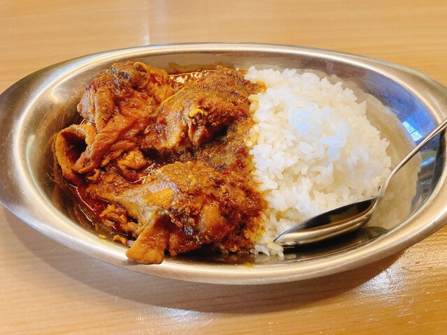 チキンカリーは本格スパイシー。付け合わせの青唐辛子、パクチー、トマトピューレは無料となります。カリーはノーマルでもホットでスパイシー。美味いです。チキンは骨付きでホロホロ。小さな骨もあるので、手でかぶりついて食べました。青唐辛子はフレッシュで強い辛さ。辛さに強い人にオススメ。辛さに弱い人はトマトでマイルドにしましょう。パクチーには豆苗が混ざっており、苦手な人でも美味しく食べられるかも。食中にごはんとカリーを少し足してくれました。お得!